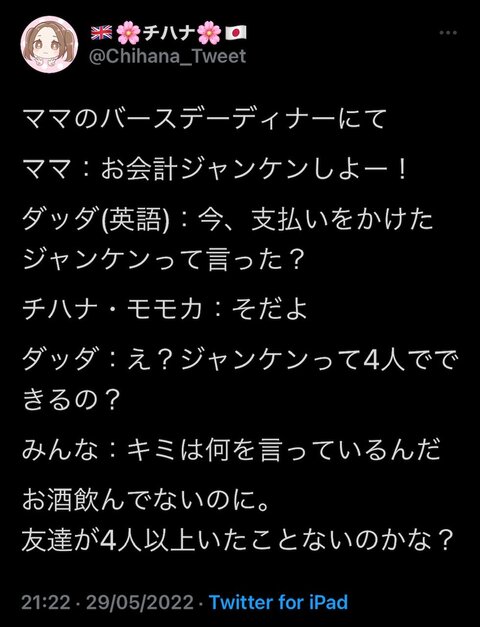 ◎チハナの暴露ツイート◎ 2022/07/12 本日は家族の汚点を色々暴露してくるチハナ(19)のツイートをご紹介。#お母さん編・・・・・・骨を拾って下さりありがとうございます・・・#お父さん編・・・なかなか辛辣・・・ 「◎娘達観察日記◎」カテゴリの最新記事 タグ :#チハナ観察日記#暴露Twitter < 前の記事次の記事 >
