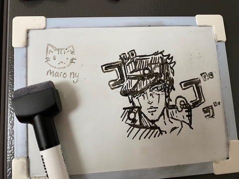 ◎帰国物語2022夏16◎ 2022/08/30 #モモカの落書きモモカ(18)がバアバのホワイトボードにマロちゃんとガチめの承太郎を描き込んだ(真顔そのホワイトボードはバアバの買い物リストなのでちゃんと消しときなよとモモカに伝えたトコローーそっち?#バアバの買い物リスト多分ヨーグルトサンド。#バアバの写 ...
