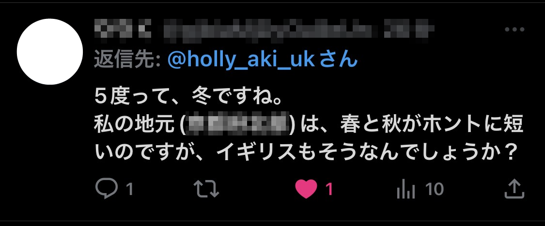 ◎ちょっと困ったメッセージ59◎ 2023/10/22 #気温編X(旧Twitter)では時折どうでも良い事をつぶやいている。この日はーー「0度」を嘆いてみた。さすればーー↓その「5度」どっから来た?しばし画像を眺めそれが午前10時の予想気温だと言う事に気が付いた。ちょっと愉快になったので軽めの返信をしてみた。さすればーー↓ちょっと何言ってるか分からない(能面てかその「5度」への執着が私は怖い・・・ちなみにスコットランドは夏が短い。 「◎徒然日記◎」カテゴリの最新記事 < 前の記事次の記事 >