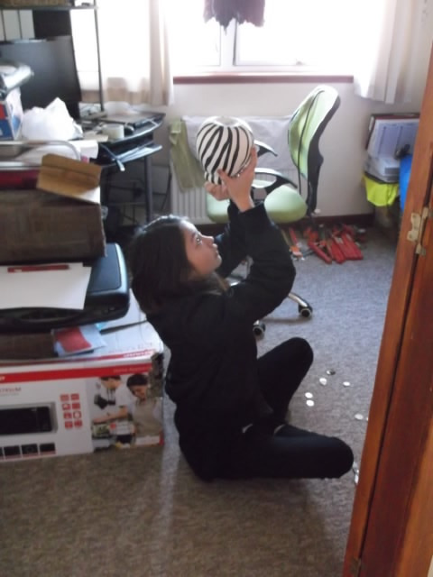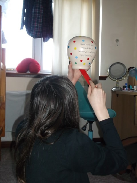 貯金箱からの奪還。モモカはハサミを突っ込み