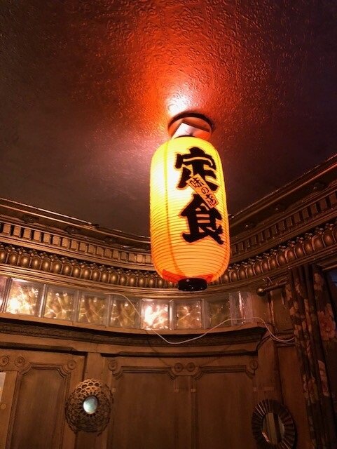 光り輝く天井に赤提灯の写真の奥に、